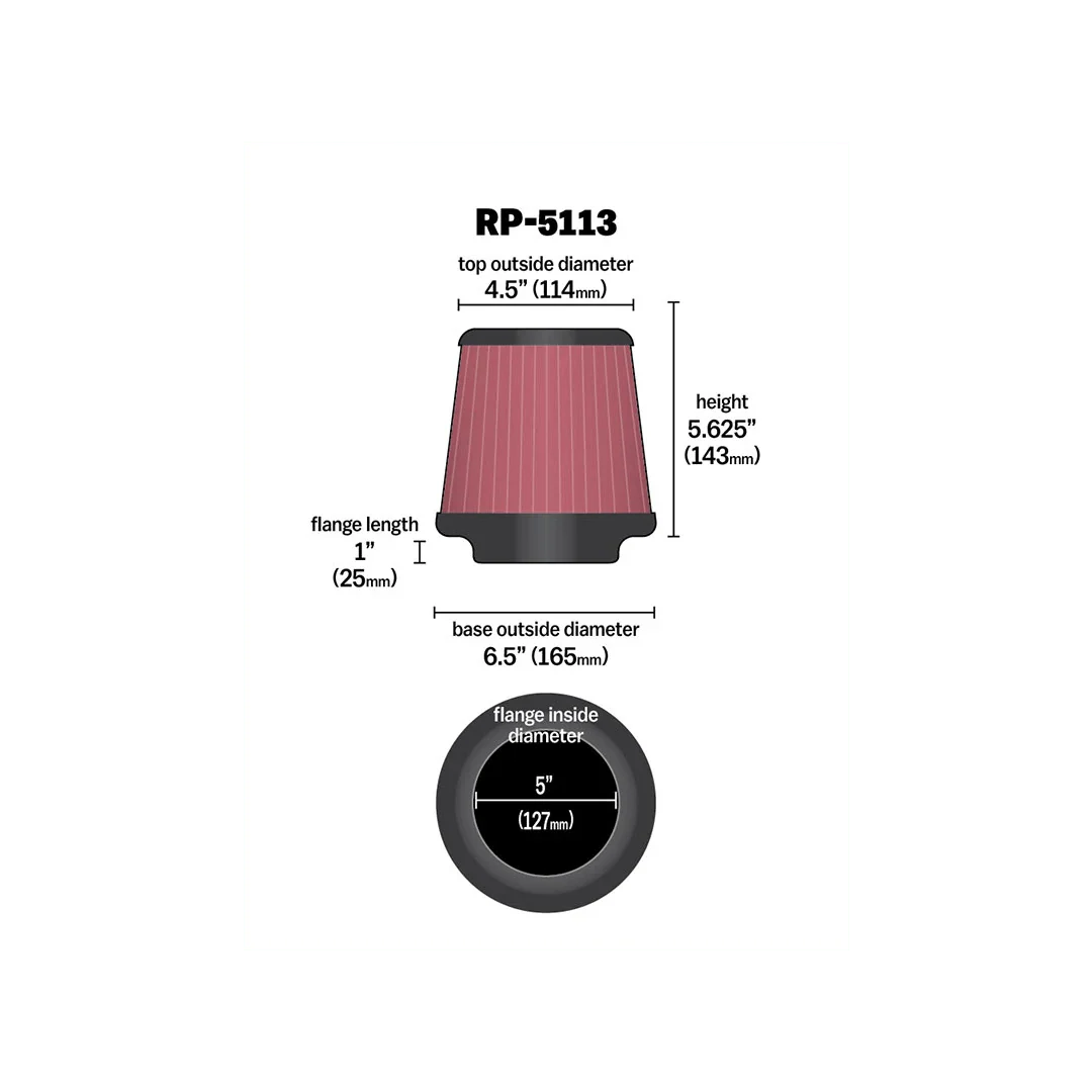 The RP-5113 features a tapered round design with precise dimensions to fit most intake systems requiring a 5-inch flange inside diameter. The base diameter measures 6.5 inches, and the overall height is 5.625 inches, making it compatible with a wide range of vehicles and aftermarket intakes.