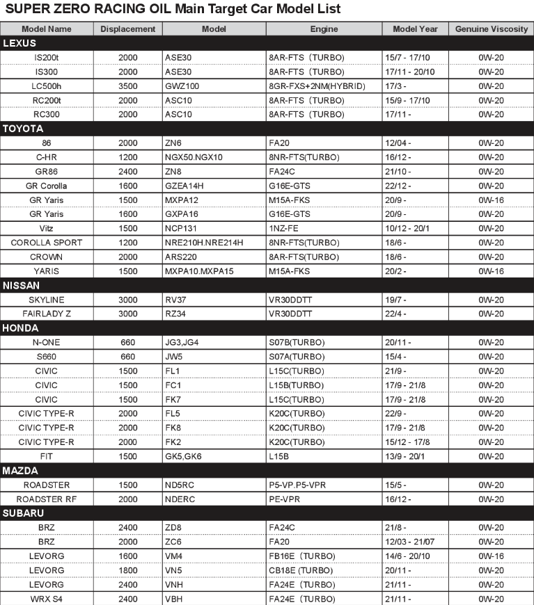 This 4-liter can of HKS Super Zero Racing Oil is compatible with most vehicles that specify 0W-20 viscosity oil, including modern sports cars and turbocharged direct injection engines. It fits a wide range of makes and models, making it a versatile choice for enthusiasts and daily drivers alike.