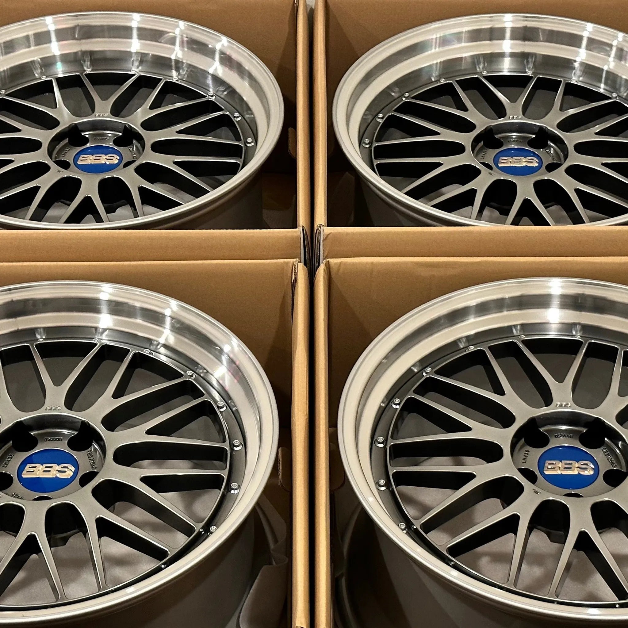 Authentic BBS LM wheels in staggered fitment for various cars. Forged construction featuring a multi-spoke mesh design with deep concavity for aggressive stance and strength.