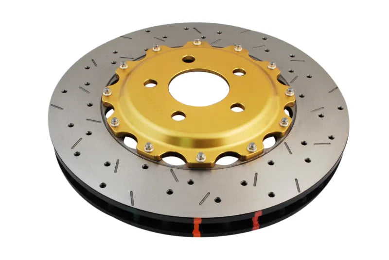 The friction ring is crafted from premium-grade iron and features a cross-drilled and slotted surface. These design elements facilitate rapid heat and gas evacuation, reducing the risk of brake fade and maintaining strong pedal feel. The gold anodized finish on the aluminum hat not only provides corrosion resistance but also adds a sporty, high-quality appearance under the wheel.