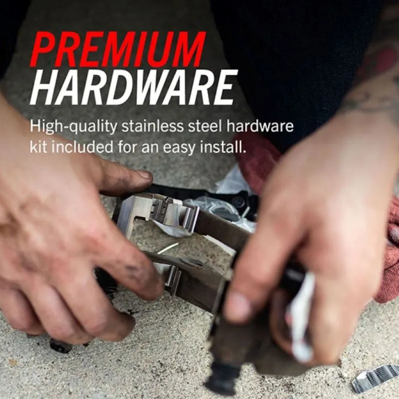 Included stainless steel hardware is corrosion-resistant and designed to secure the pads firmly in place, preventing rattles and ensuring reliable operation throughout the life of the brake pads.