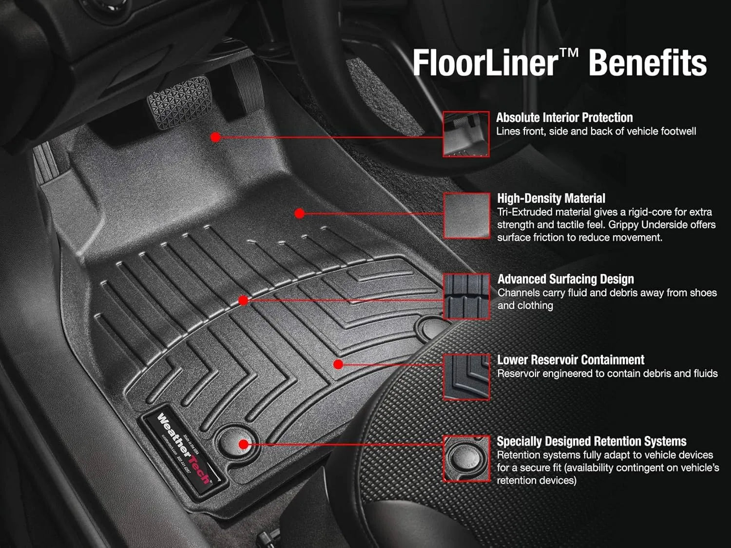 The WeatherTech FloorLiner DigitalFit accurately and completely lines the interior carpet giving "absolute interior protection". Digital laser measurements of interior surfaces offer a consistently perfect fit. A patent pending HighDensity TriExtruded (HDTE) material allows for a rigid core for strength while offering surface friction to the carpet, as well as tactile feel to the surface. Advanced surfacing creates channels that carry fluids and debris to a lower reservoir with further channeling to help minimize fluid movement while driving. Once fluids become trapped in the reservoir, away from shoes and clothing, they are easily removed from the WeatherTech FloorLiner DigitalFit over the door sill. No muss-no fuss. 3 year warranty.