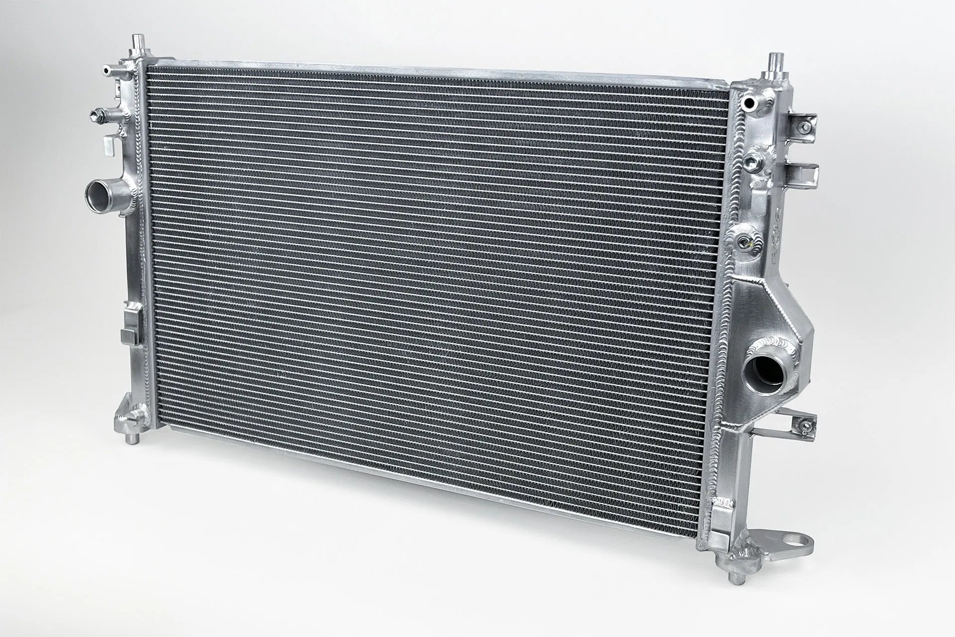 The CSF radiator is crafted entirely from aluminum with TIG-welded joints, ensuring a lightweight yet extremely durable core. The large 2-row core design, combined with advanced B-Tube technology, optimizes heat transfer and fluid flow. The multi-louvered 5mm fins maximize surface contact with air, improving cooling efficiency without restricting airflow. CNC-machined brackets and OEM-style fittings provide a true plug-and-play experience, maintaining factory mounting points and inlet/outlet locations for a seamless replacement.