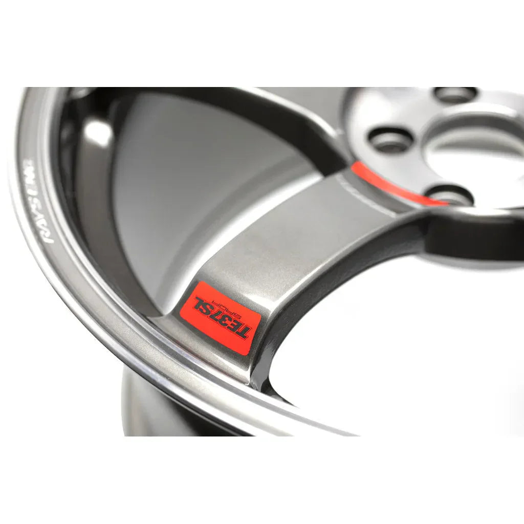 The TE37 Saga SL features a classic six-spoke design that emphasizes strength and lightweight performance. The spokes exhibit a subtle concavity that enhances the wheel’s aggressive stance while maintaining structural integrity. The pressed graphite finish adds a refined texture that resists showing brake dust and road grime, keeping the wheels looking sharp over time.