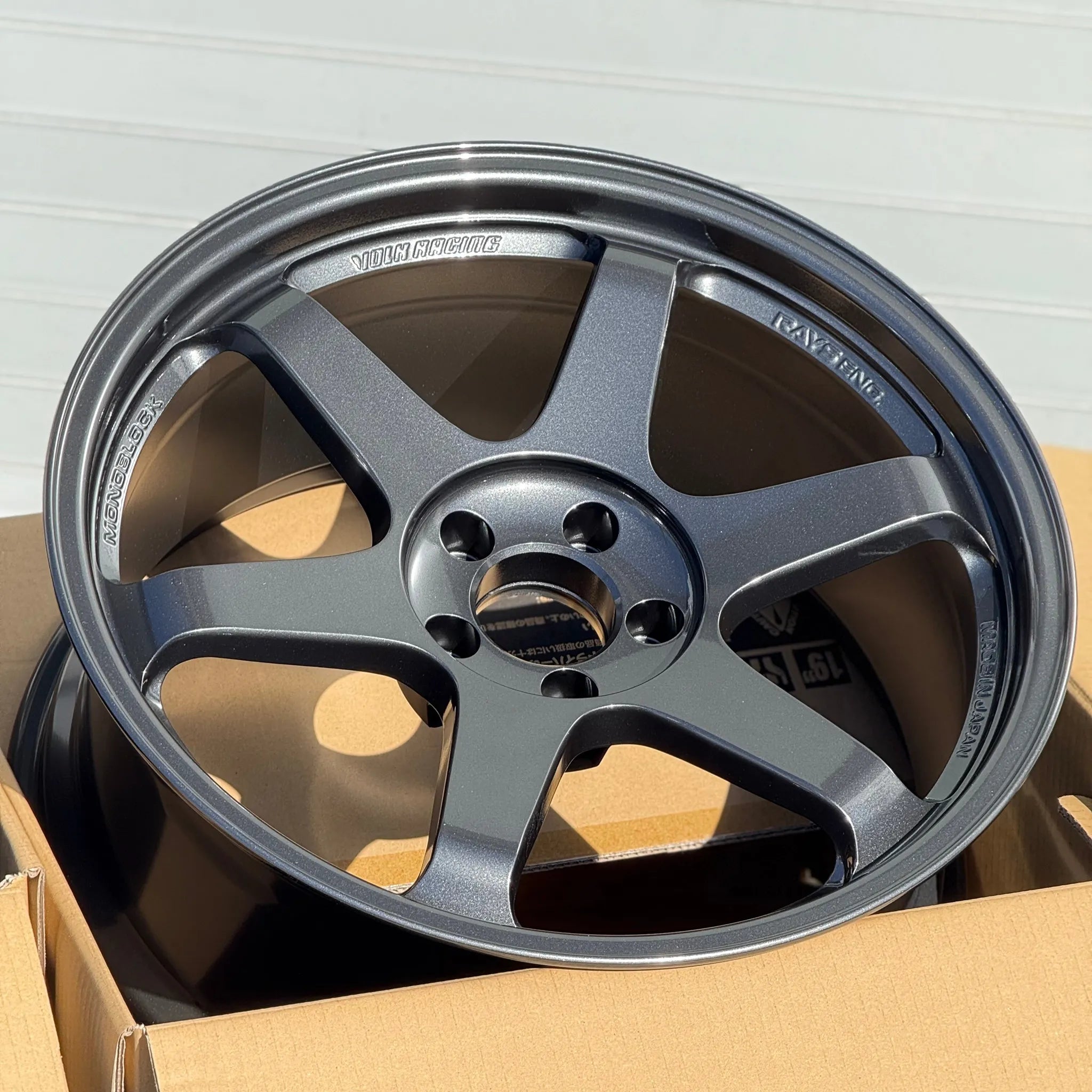 Authentic Volk Racing TE37SL wheels in aggressive fitment for various cars. Forged monoblock construction with deep concave six-spoke design and a durable dark gunmetal finish in a staggered setup for optimized traction.