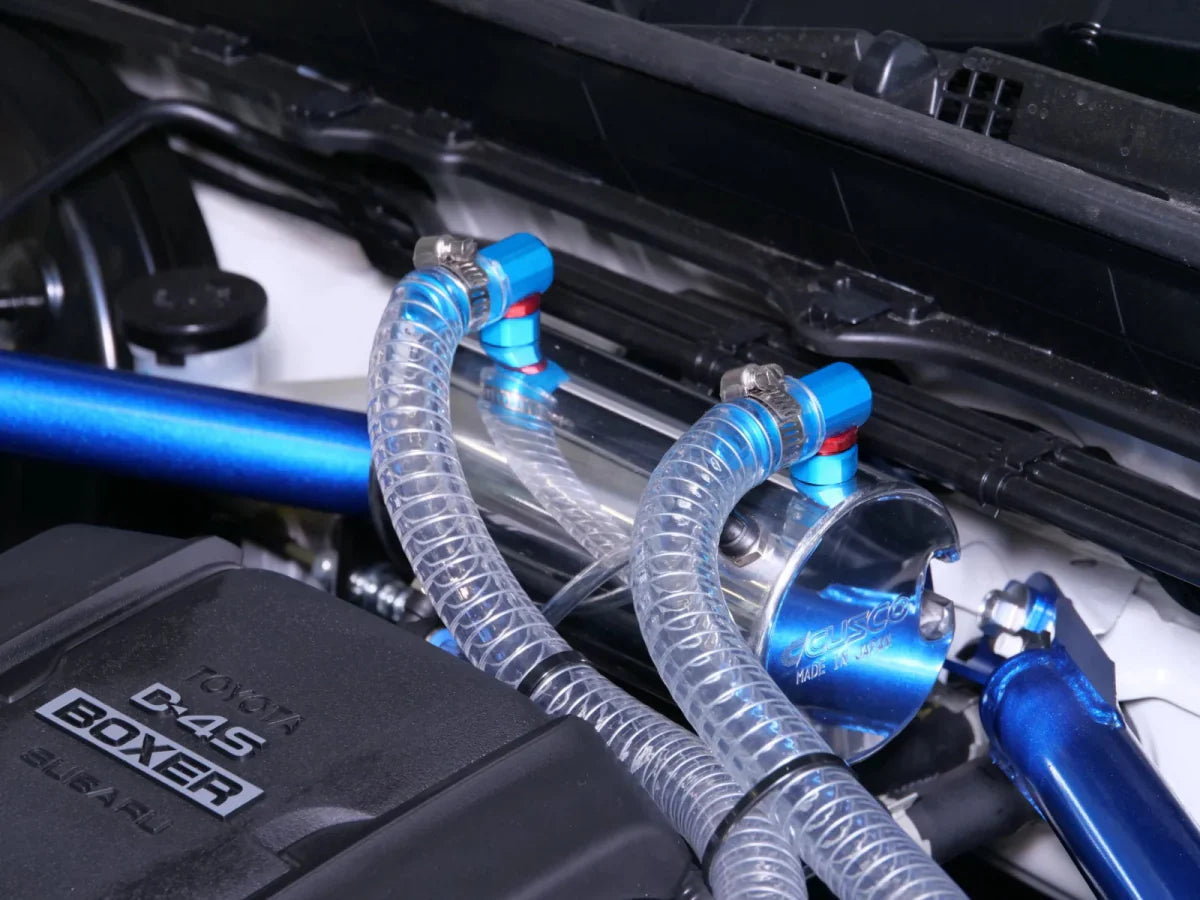 The Cusco Oil Catch Tank Kit is a precision-engineered solution designed to improve engine performance and longevity for popular sports cars including the Scion FR-S, Subaru BRZ, Toyota 86, and Toyota GR86. By effectively capturing blowby gases and oil vapors that would otherwise re-enter the intake system, this catch tank helps maintain cleaner combustion chambers and reduces carbon buildup. This results in more consistent horsepower delivery and a smoother running engine over time.
