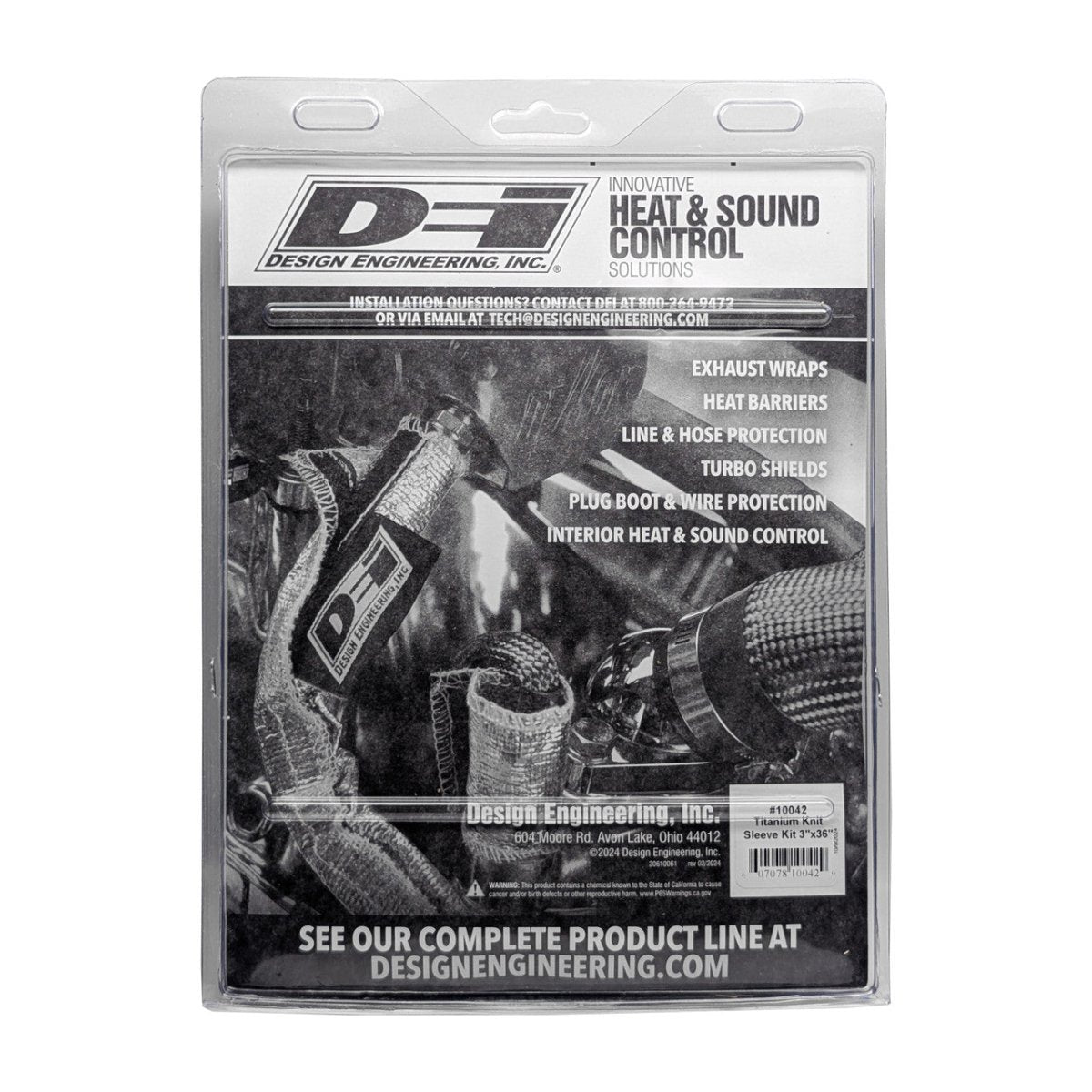 DEI Titanium Exhaust Sleeve offers superior heat protection with a 3-inch diameter and 36-inch length. Rated up to 1800°F, it expands 1.5x for easy installation over flanges and sensors. Durable, flexible, and perfect for reducing heat transfer to your cabin. Includes ties and tool for quick fitting.