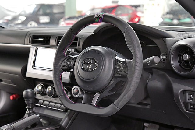 The HKS Direct Fit Steering Wheel is engineered for drivers who seek enhanced precision, comfort, and style in their Subaru BRZ, Toyota GR86, and Toyota GT86. This premium steering wheel features a sporty D-shaped design that increases legroom and delivers a more engaging driving experience, whether you're on the street or the track. Crafted from high-quality cowhide leather with perforated grip zones, it offers a luxurious feel and superior control during spirited driving. The smaller diameter compared to the OEM wheel provides quicker steering response without sacrificing strength or durability.