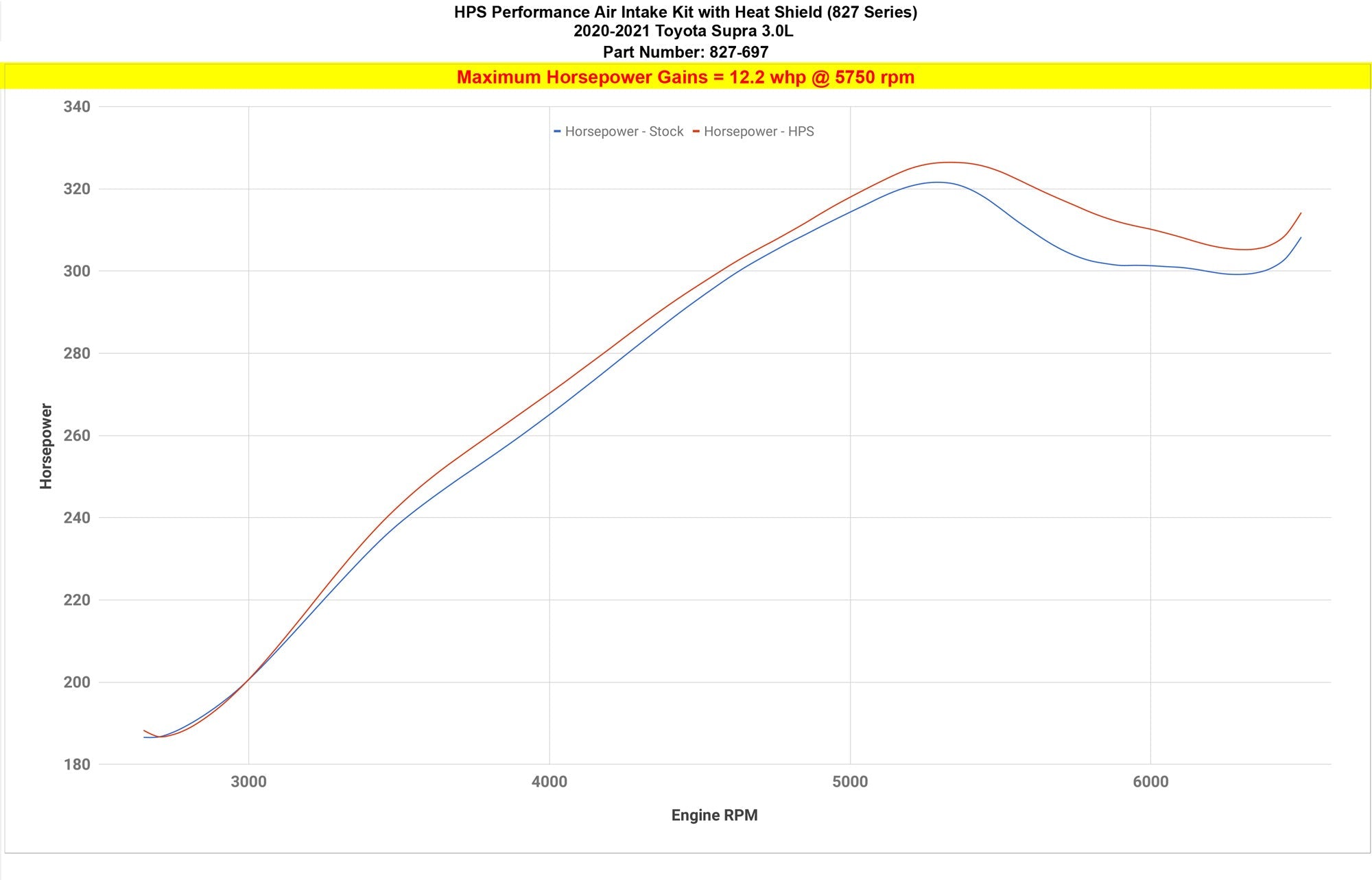 HPS Performance 827 Series air intake kit (Part # 827-697) for 2020-2021 Toyota GR Supra 3.0L Turbo offers a free-flowing 3-1/2 inch mandrel-bent aluminum tube induction system designed to produce dyno proven performance gains - increase horsepower +12.2 whp , torque +11.2 ft/lbs and improve throttle response while maintaining safe air fuel ratio. The heavy duty powder coated steel heat shield blocks out hot air from the engine for the best cooling effect. The included installation manual has clear pictures and instructions to guide the installer throughout the whole process. The kit does NOT require tuning and does not trigger CEL light. No modification is required during the installation. HPS light weight mandrel-bent aluminum alloy tube replaces the stock restrictive air box and optimizes the airflow with excellent heat dissipation and long lasting durability. HPS Performance 827 Series shortram cold air intake kit features race proven reinforced silicone hoses and industrial grade 100% stainless steel t-bolt clamps which ensures reliability, even during the most extreme driving conditions. Proudly made in the United States, the All-New HPS Performance Air Filter is designed with performance in mind, delivering excellent filtration without sacrificing airflow.
