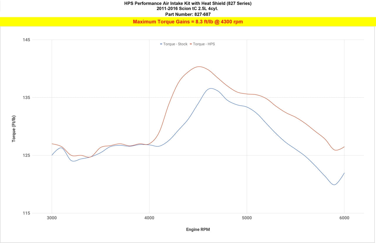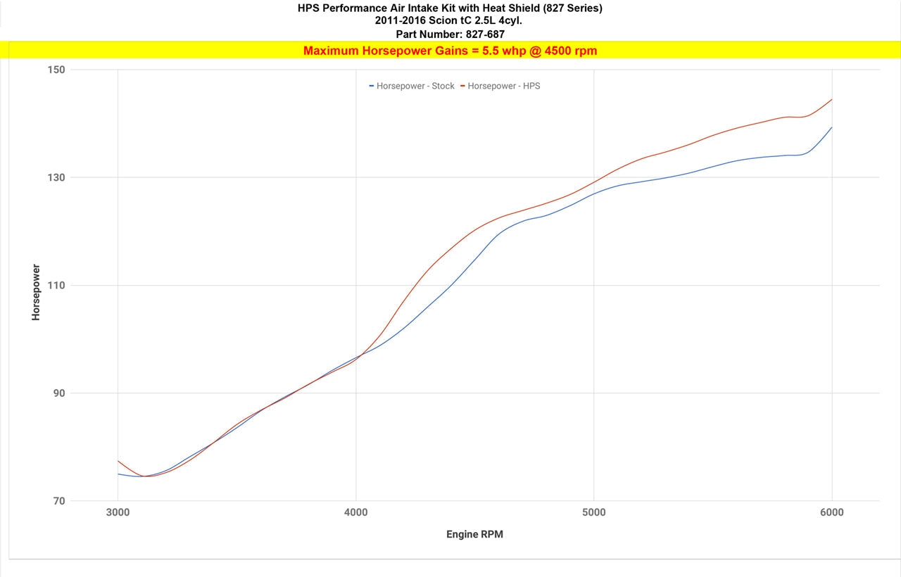 HPS Performance 827 Series air intake kit (Part # 827-687) for 2nd Gen 2011-2016 Scion tC 2.5L offers a free-flowing 3 inch mandrel-bent aluminum tube induction system designed to produce dyno proven performance gains - increase horsepower +5.5 whp , torque +8.3 ft/lbs and improve throttle response while maintaining safe air fuel ratio. The heavy duty powder coated steel heat shield blocks out hot air from the engine for the best cooling effect. The included installation manual has clear pictures and instructions to guide the installer throughout the whole process. The kit does NOT require tuning and does not trigger CEL light. No modification is required during the installation. HPS light weight mandrel-bent aluminum alloy tube replaces the stock restrictive air box and optimizes the airflow with excellent heat dissipation and long lasting durability. HPS Performance 827 Series shortram cold air intake kit features race proven reinforced silicone hoses and industrial grade 100% stainless steel t-bolt clamps which ensures reliability, even during the most extreme driving conditions. Proudly made in the United States, the All-New HPS Performance Air Filter is designed with performance in mind, delivering excellent filtration without sacrificing airflow.