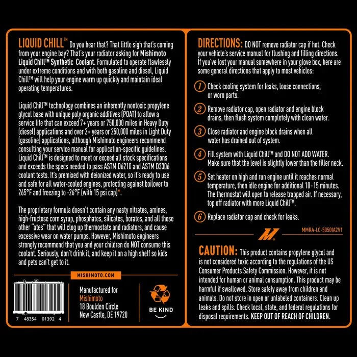 {"id":10044625846568,"title":"Mishimoto Liquid Chill Engine Coolant: Fits Most Models","handle":"mishimoto-liquid-chill-engine-coolant-premixed","description":"Mishimoto Liquid Chill Engine Coolant offers superior protection with advanced additives, reducing engine wear and corrosion. Pre-mixed and ready to use, it fits most models and safeguards engines against boilover up to 265°F and freezing to -26°F. Compatible with all radiator types, it extends engine life and seals pinhole leaks for reliable, year-round performance in both gasoline and diesel engines.","published_at":"2025-12-11T19:10:44-08:00","created_at":"2025-12-11T14:18:26-08:00","vendor":"Mishimoto","type":"Engine Components","tags":["activeYMM","Brand-Mishimoto","LCPUSH","newt14","Pushed - 2025-12-12T03:10:46Z","smpush","t14brandproduct","YMM_2004_2006_Scion_xA","YMM_2004_2006_Scion_xB","YMM_2005_2010_Scion_tC","YMM_2008_2014_Scion_xD","YMM_2008_2015_Scion_xB","YMM_2011_2016_Scion_tC","YMM_2012_2015_Scion_iQ","YMM_2013_2016_Scion_FR-S","YMM_2013_2020_Subaru_BRZ","YMM_2016_Scion_iA","YMM_2016_Scion_iM","YMM_2017_2020_Toyota_86","YMM_2020_2026_Toyota_GR_Supra","YMM_2022_2026_Subaru_BRZ","YMM_2022_2026_Toyota_GR86","YMM_2023_2026_Toyota_GR_Corolla"],"price":5595,"price_min":5595,"price_max":5595,"available":true,"price_varies":false,"compare_at_price":6200,"compare_at_price_min":6200,"compare_at_price_max":6200,"compare_at_price_varies":false,"variants":[{"id":51196918890792,"title":"Default Title","option1":"Default Title","option2":null,"option3":null,"sku":"MMRA-LC-5050F","requires_shipping":true,"taxable":true,"featured_image":null,"available":true,"name":"Mishimoto Liquid Chill Engine Coolant: Fits Most Models","public_title":null,"options":["Default Title"],"price":5595,"weight":2268,"compare_at_price":6200,"inventory_management":"shopify","barcode":null,"requires_selling_plan":false,"selling_plan_allocations":[],"quantity_rule":{"min":1,"max":null,"increment":1}}],"images":["\/\/fastscions.com\/cdn\/shop\/files\/mishimoto-liquid-chill-engine-coolant-premixed-mmra-lc-5050f-5187270.webp?v=1765491508","\/\/fastscions.com\/cdn\/shop\/files\/mishimoto-liquid-chill-engine-coolant-premixed-mmra-lc-5050f-6154283.webp?v=1765491508","\/\/fastscions.com\/cdn\/shop\/files\/mishimoto-liquid-chill-engine-coolant-premixed-mmra-lc-5050f-3109959.webp?v=1765491508","\/\/fastscions.com\/cdn\/shop\/files\/mishimoto-liquid-chill-engine-coolant-premixed-mmra-lc-5050f-2755286.webp?v=1765491508","\/\/fastscions.com\/cdn\/shop\/files\/mishimoto-liquid-chill-engine-coolant-premixed-mmra-lc-5050f-2146350.webp?v=1765491508","\/\/fastscions.com\/cdn\/shop\/files\/mishimoto-liquid-chill-engine-coolant-premixed-mmra-lc-5050f-6800640.webp?v=1765491508","\/\/fastscions.com\/cdn\/shop\/files\/mishimoto-liquid-chill-engine-coolant-premixed-mmra-lc-5050f-1411769.webp?v=1765491508"],"featured_image":"\/\/fastscions.com\/cdn\/shop\/files\/mishimoto-liquid-chill-engine-coolant-premixed-mmra-lc-5050f-5187270.webp?v=1765491508","options":["Title"],"media":[{"alt":null,"id":43167602999592,"position":1,"preview_image":{"aspect_ratio":1.0,"height":700,"width":700,"src":"\/\/fastscions.com\/cdn\/shop\/files\/mishimoto-liquid-chill-engine-coolant-premixed-mmra-lc-5050f-5187270.webp?v=1765491508"},"aspect_ratio":1.0,"height":700,"media_type":"image","src":"\/\/fastscions.com\/cdn\/shop\/files\/mishimoto-liquid-chill-engine-coolant-premixed-mmra-lc-5050f-5187270.webp?v=1765491508","width":700},{"alt":null,"id":43167603032360,"position":2,"preview_image":{"aspect_ratio":1.0,"height":700,"width":700,"src":"\/\/fastscions.com\/cdn\/shop\/files\/mishimoto-liquid-chill-engine-coolant-premixed-mmra-lc-5050f-6154283.webp?v=1765491508"},"aspect_ratio":1.0,"height":700,"media_type":"image","src":"\/\/fastscions.com\/cdn\/shop\/files\/mishimoto-liquid-chill-engine-coolant-premixed-mmra-lc-5050f-6154283.webp?v=1765491508","width":700},{"alt":null,"id":43167603065128,"position":3,"preview_image":{"aspect_ratio":1.0,"height":700,"width":700,"src":"\/\/fastscions.com\/cdn\/shop\/files\/mishimoto-liquid-chill-engine-coolant-premixed-mmra-lc-5050f-3109959.webp?v=1765491508"},"aspect_ratio":1.0,"height":700,"media_type":"image","src":"\/\/fastscions.com\/cdn\/shop\/files\/mishimoto-liquid-chill-engine-coolant-premixed-mmra-lc-5050f-3109959.webp?v=1765491508","width":700},{"alt":null,"id":43167603097896,"position":4,"preview_image":{"aspect_ratio":1.0,"height":700,"width":700,"src":"\/\/fastscions.com\/cdn\/shop\/files\/mishimoto-liquid-chill-engine-coolant-premixed-mmra-lc-5050f-2755286.webp?v=1765491508"},"aspect_ratio":1.0,"height":700,"media_type":"image","src":"\/\/fastscions.com\/cdn\/shop\/files\/mishimoto-liquid-chill-engine-coolant-premixed-mmra-lc-5050f-2755286.webp?v=1765491508","width":700},{"alt":null,"id":43167603130664,"position":5,"preview_image":{"aspect_ratio":1.0,"height":700,"width":700,"src":"\/\/fastscions.com\/cdn\/shop\/files\/mishimoto-liquid-chill-engine-coolant-premixed-mmra-lc-5050f-2146350.webp?v=1765491508"},"aspect_ratio":1.0,"height":700,"media_type":"image","src":"\/\/fastscions.com\/cdn\/shop\/files\/mishimoto-liquid-chill-engine-coolant-premixed-mmra-lc-5050f-2146350.webp?v=1765491508","width":700},{"alt":null,"id":43167603163432,"position":6,"preview_image":{"aspect_ratio":1.0,"height":700,"width":700,"src":"\/\/fastscions.com\/cdn\/shop\/files\/mishimoto-liquid-chill-engine-coolant-premixed-mmra-lc-5050f-6800640.webp?v=1765491508"},"aspect_ratio":1.0,"height":700,"media_type":"image","src":"\/\/fastscions.com\/cdn\/shop\/files\/mishimoto-liquid-chill-engine-coolant-premixed-mmra-lc-5050f-6800640.webp?v=1765491508","width":700},{"alt":null,"id":43167603196200,"position":7,"preview_image":{"aspect_ratio":1.0,"height":700,"width":700,"src":"\/\/fastscions.com\/cdn\/shop\/files\/mishimoto-liquid-chill-engine-coolant-premixed-mmra-lc-5050f-1411769.webp?v=1765491508"},"aspect_ratio":1.0,"height":700,"media_type":"image","src":"\/\/fastscions.com\/cdn\