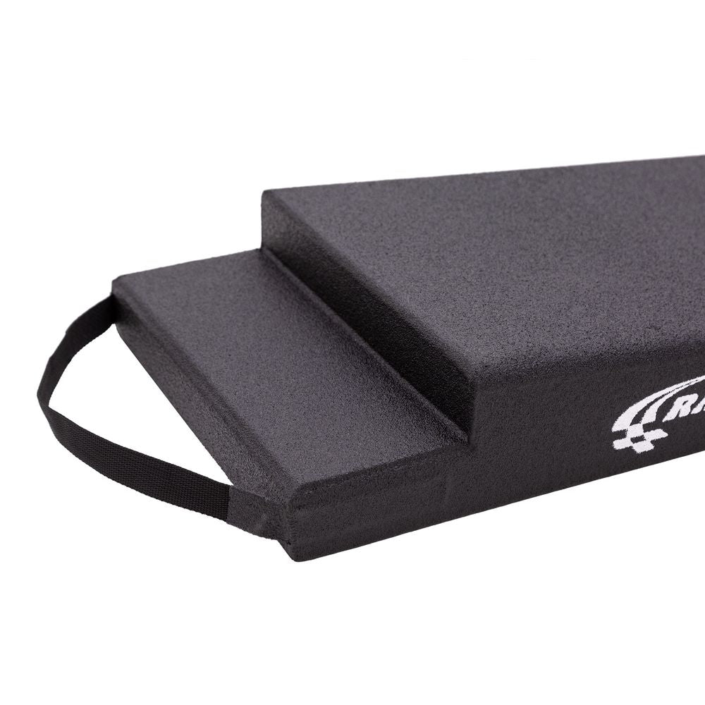 Race Ramps utilize a unique, patented process to create ramps from solid high-density foam, resulting in a product that is both lightweight and incredibly strong. The foam core provides structural integrity while the anti-slip coating enhances safety by preventing tire slippage. This combination ensures durability and longevity without the bulk and weight of traditional metal ramps.