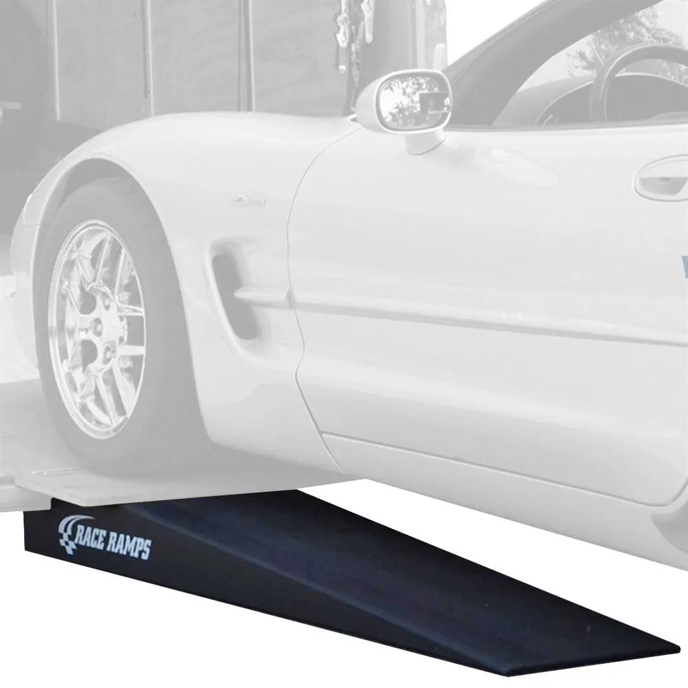 Race Ramps Trailer Ramp pair offers a 7" height with a 5.5° approach angle, perfect for loading low-profile vehicles without scrapes. Each lightweight ramp supports up to 1,500 lbs and features a 16" flap to fit 12-16" trailer flaps. Made from durable, high-density foam with an anti-slip coating, they’re easy to use—just lower your trailer door into the notch and drive up smoothly. Ideal for tire widths up to 12", these ramps fit most trailers and ensure safe, hassle-free loading every time.